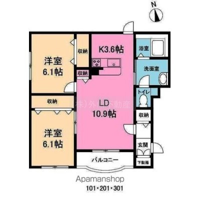 2LDK(62.02m²)└ LD10.9×K3.6×洋6.1×洋6.1
