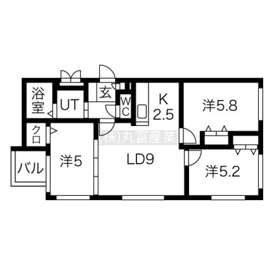 3LDK(58.51m²)└ LD9帖 K2.5帖 洋室5帖 洋室5.8帖 洋室5.2帖