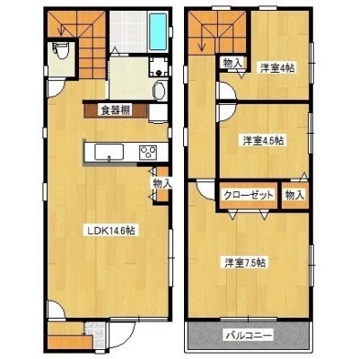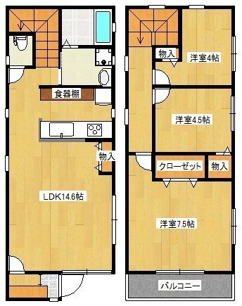 3LDK(74.43m²)└ 1階:LDK14.6帖 / 2階:洋室7.5帖 洋室4.5帖 洋室4帖