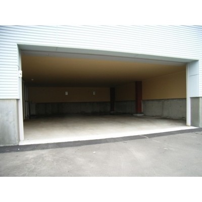 ここに注目!車庫は奥行きたっぷり、高さは1.8m。入口は電動シャッターです。要セット契約