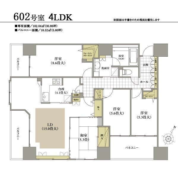 4LDK(102.04m²)└ 6階:LDK19.1帖 洋室8.6帖 洋室5.6帖 洋室5.3帖 和室5.3帖