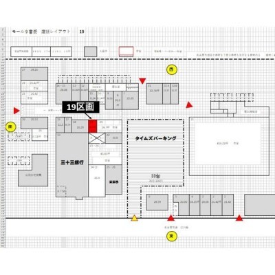 所在階/建物の階建 1階(19区画) / 地上1階建 主要採光面 構造 鉄筋コンクリート(RC)造 間取り 契約期間 2年間 権利金 住宅保険 出店推奨業種 出店不可業種 引渡し 相談 管理人 取引態様 仲介 物件No 設備・特徴 備考 店舗 -