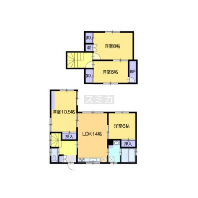 4LDK(96.39m²)└ 1階:LDK14帖 洋室6帖 洋室10.5帖 / 2階:洋室8帖 洋室6帖