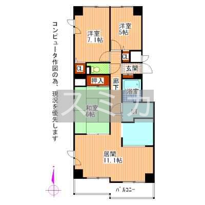 3LDK(70.39m²)└ LD11.1帖 K3帖 洋室7.1帖 洋室5帖 和室6帖