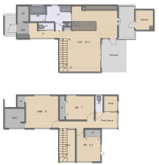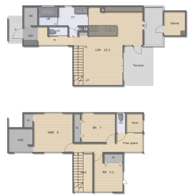 3LDK(112.41m²)└ 1階:LDK22.2帖 / 2階:洋室8帖 洋室5.2帖 洋室7帖