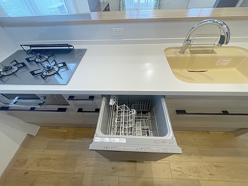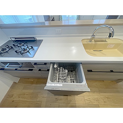 深型食洗器付き、浄水器付き、ガラストップタイプの三口コンロ、人造大理石カウンター!