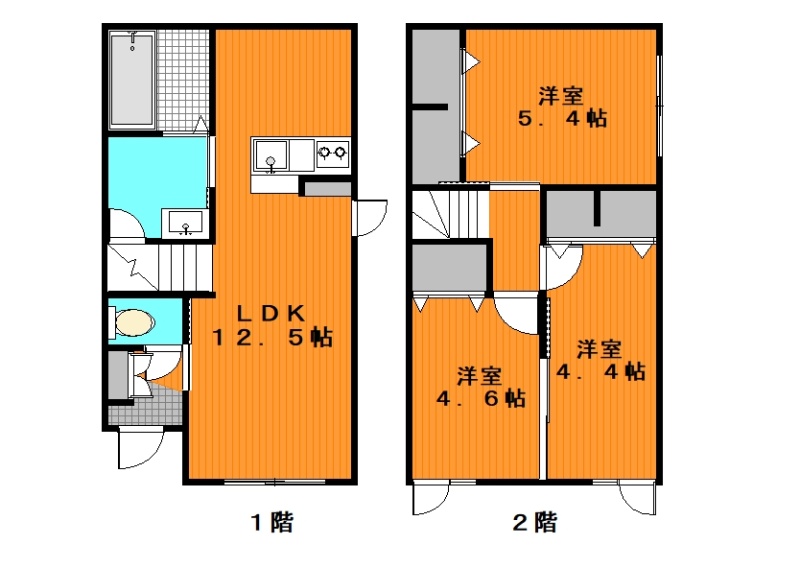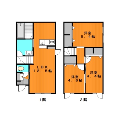 3LDK(67.66m²)└ 1階:LDK12.5帖 / 2階:洋室5.4帖 洋室4.6帖 洋室4.4帖
