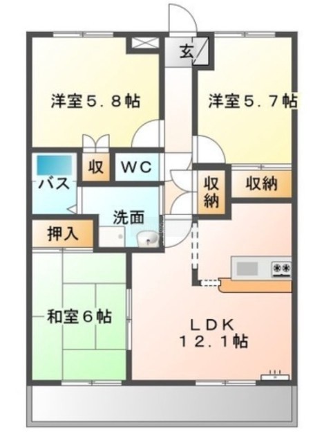 3LDK(66m²)└ 和室6帖 洋室5.8帖 洋室5.7帖 LDK12.1帖