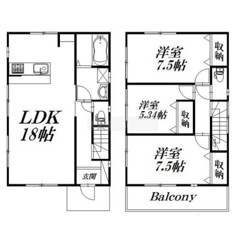 3LDK(89.42m²)└ 洋室7.5帖 洋室7.5帖 洋室5.34帖 LDK18帖