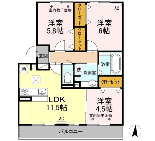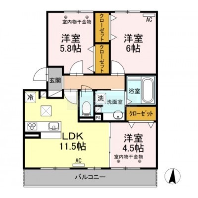 3LDK(64.8m²)└ 洋室6帖 LDK11.5帖 洋室5.8帖 洋室4.5帖