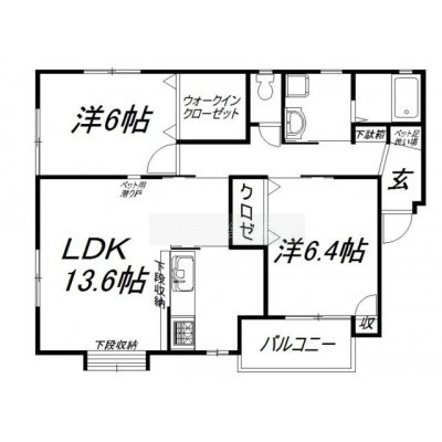 2LDK(62.61m²)└ 洋室6帖 洋室6.4帖 LDK13.6帖