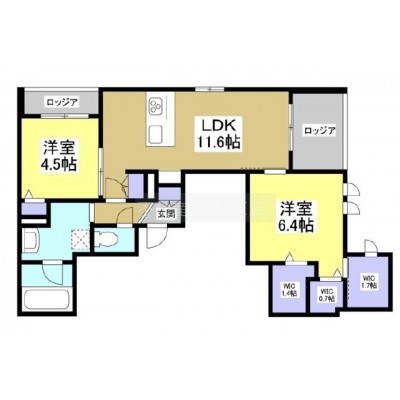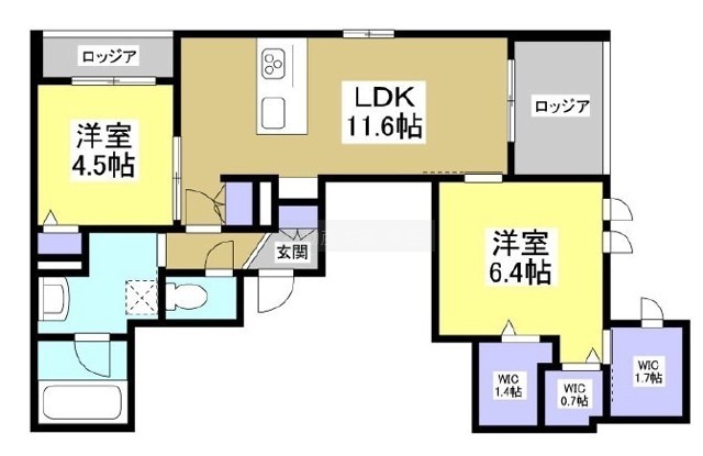 2LDK(60.83m²)└ 洋室6.4帖 洋室4.5帖 LDK11.6帖