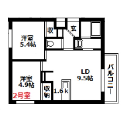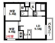 2LDK(46.97m²)└ 1階:LD9.5帖 K1.6帖 洋室5.4帖 洋室4.9帖