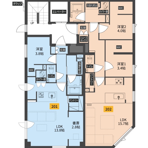 2LDK(52.95m²)└ 2階:LDK13.8帖 洋室3.8帖 洋室2.8帖