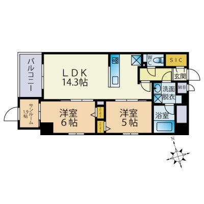 2SLDK(61.74m²)└ LDK14.3帖 洋室6帖 洋室5帖