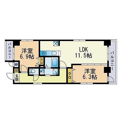 2LDK(61.48m²)└ LDK11.5帖 洋室6.9帖 洋室6.3帖