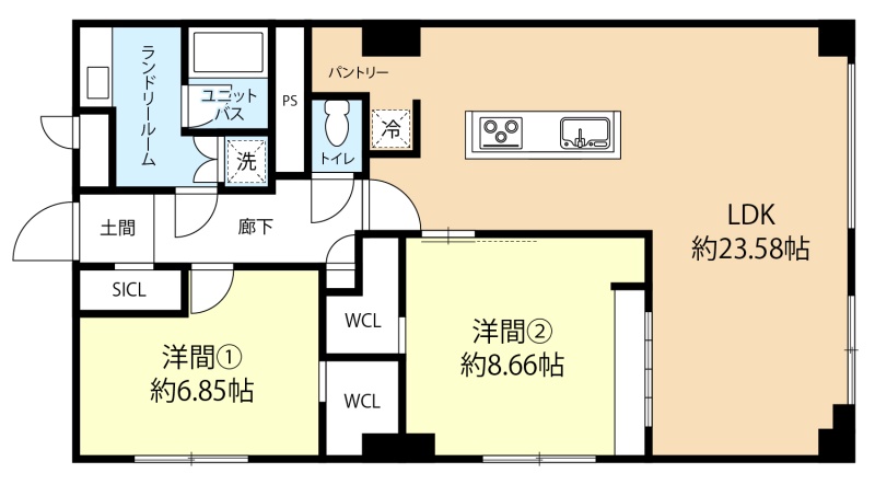 2LDK(93.23m²)└ LDK23.58帖 洋室8.66帖 洋室6.85帖