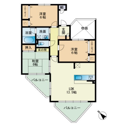3LDK(77.67m²)└ LDK13.5帖 洋室6帖 洋室6帖 和室6帖