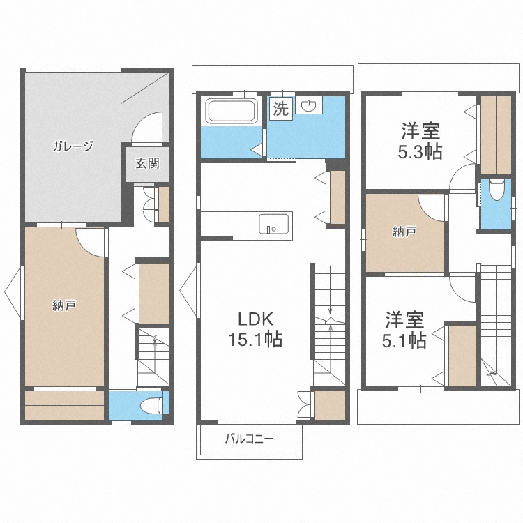 2SLDK(110.84m²)└ 1階:S / 2階:LDK15.1帖 / 3階:洋室5.1帖 洋室5.3帖
