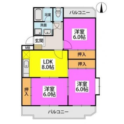 3LDK(64.02m²)└ LDK8帖 洋室6帖 洋室6帖 洋室6帖