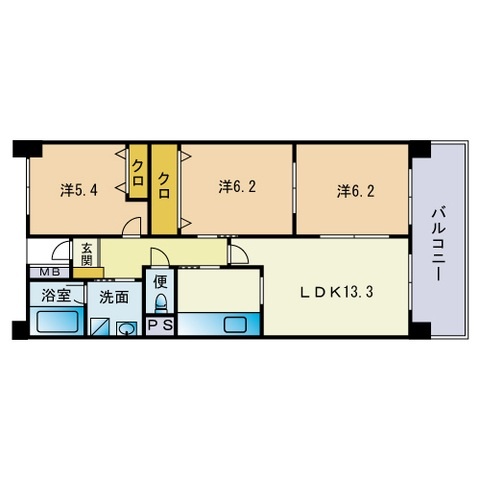 3LDK(69.6m²)└ LDK13.3帖 洋室5.4帖 洋室6.2帖 洋室6.2帖