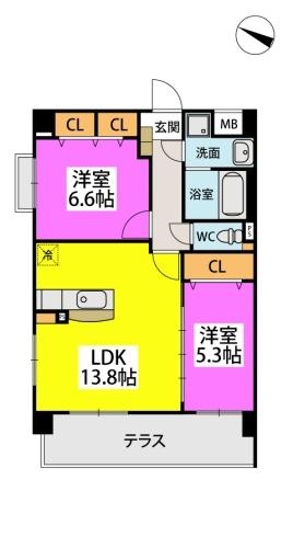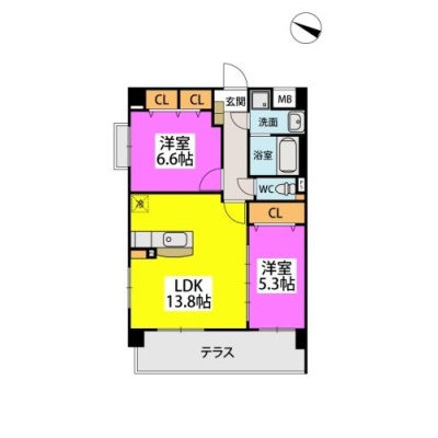 2LDK(57.67m²)└ LDK13.8帖 洋室5.3帖 洋室6.6帖