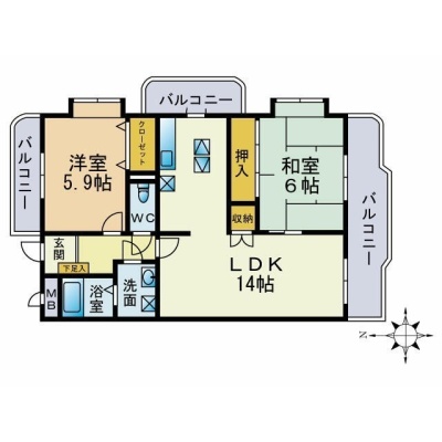 2LDK(61.83m²)└ LDK14帖 洋室5.9帖 和室6帖