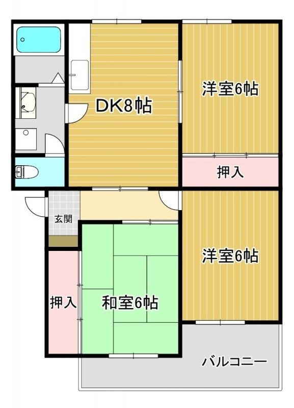 3DK(66m²)└ DK8帖 洋室6帖 洋室6帖 和室6帖