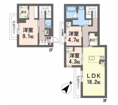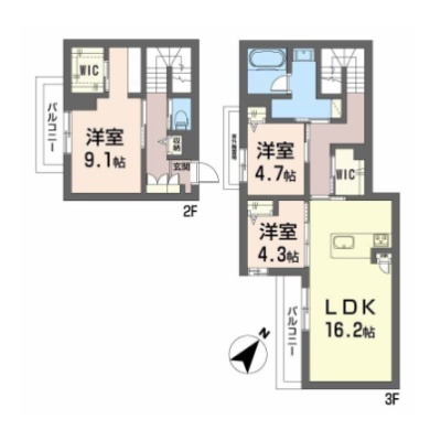 3LDK(95.83m²)└ LDK16.2帖 洋室4.7帖 洋室9.1帖 洋室4.3帖