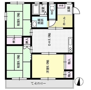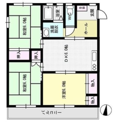 3DK(59.6m²)└ DK6帖 洋室6帖 和室6帖 洋室6帖