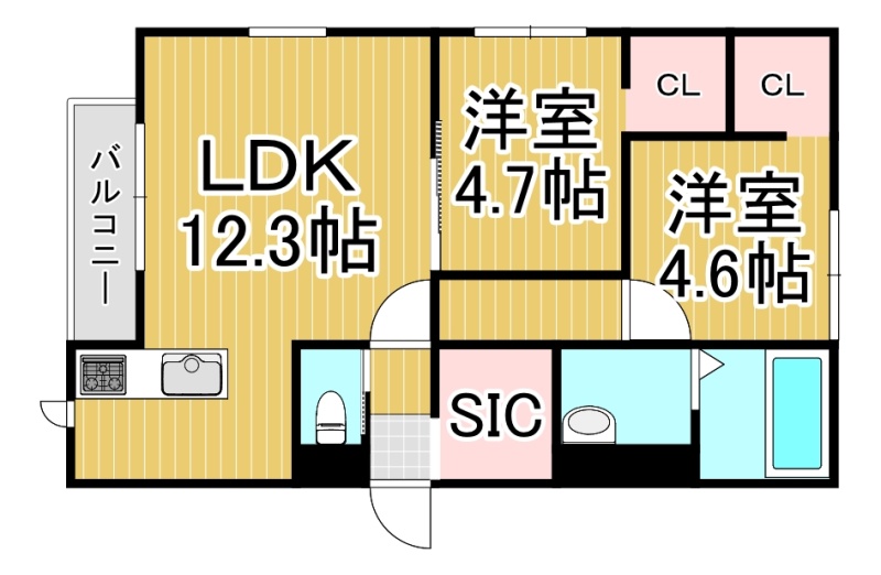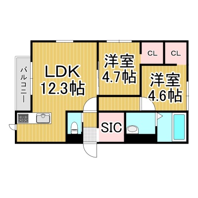 2LDK(53.63m²)└ LDK12.3帖 洋室4.7帖 洋室4.6帖