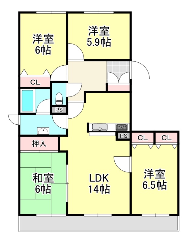 4LDK(80.28m²)└ LDK14帖 洋室6.5帖 洋室6帖 洋室5.9帖 和室6帖