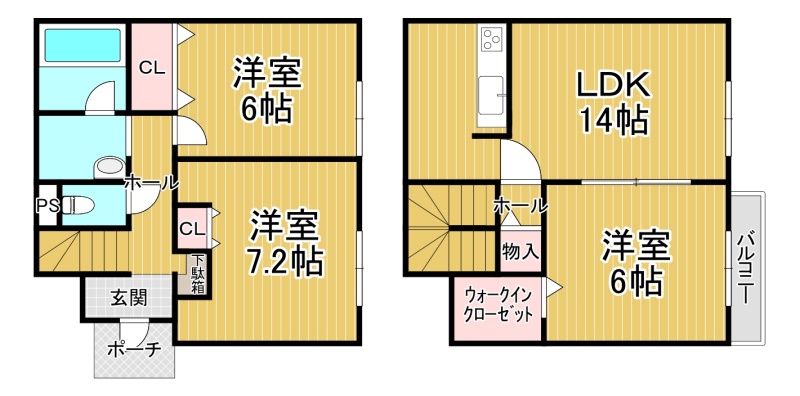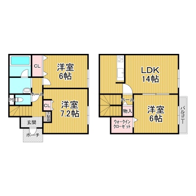 3LDK(80.22m²)└ 1階:洋室7.2帖 洋室6帖 / 2階:LDK14帖 洋室6帖