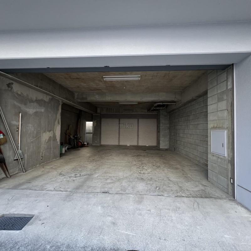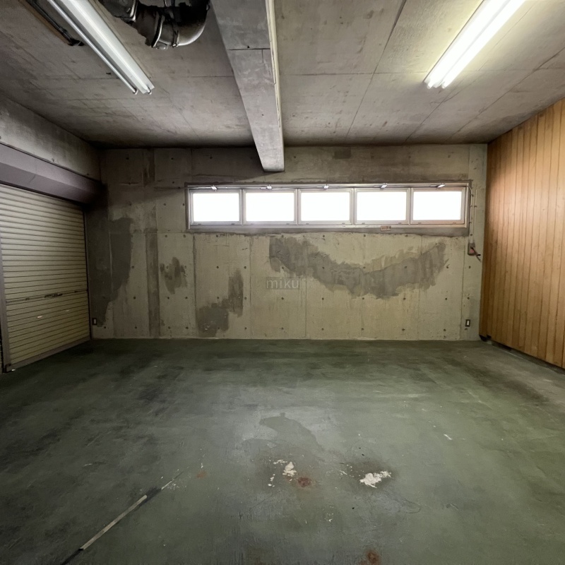 ここに注目!倉庫付事務所!!シャッター及び屋根付き駐車場の後方に倉庫あり。倉庫シャッター部より荷物の出し入れ可能です。