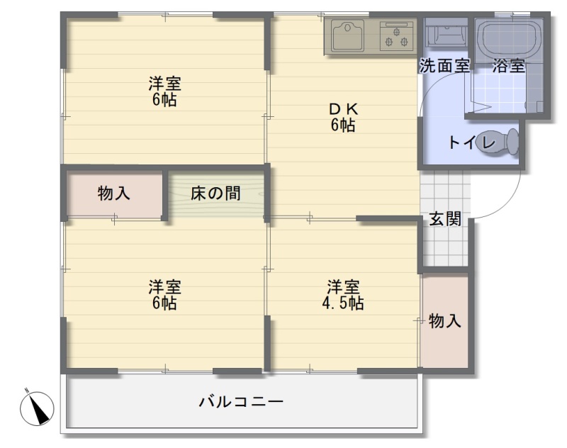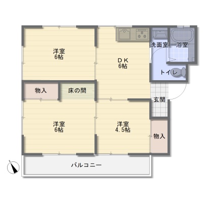 3DK(49m²)└ 洋室6帖 洋室6帖 洋室4.5帖 DK6帖