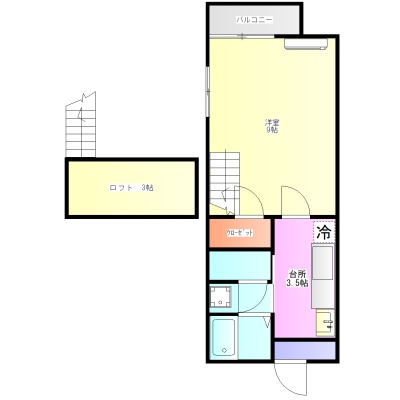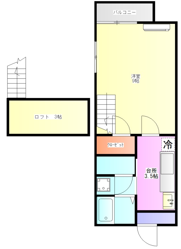 1K(27.8m²)└ 1階:洋室9帖 K3.5帖 その他3帖