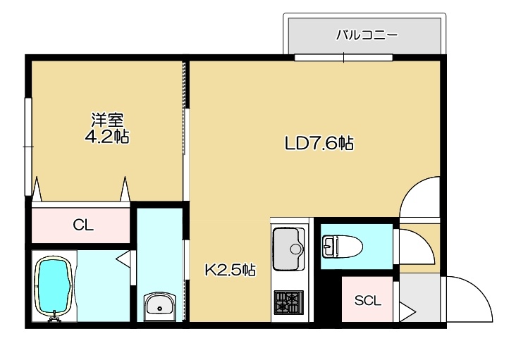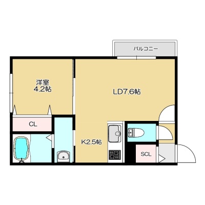 1LDK(33.03m²)└ LD7.6帖 K2.5帖 洋室4.2帖