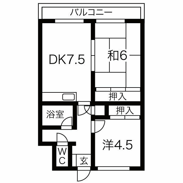 2DK(45.36m²)└ DK7.5帖 洋室6帖 洋室4帖