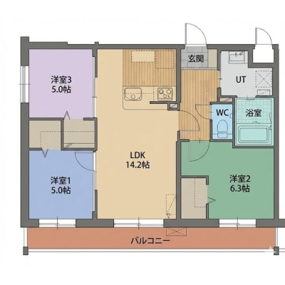3LDK(69.36m²)└ LDK14.2帖 洋室6.3帖 洋室5帖 洋室5帖