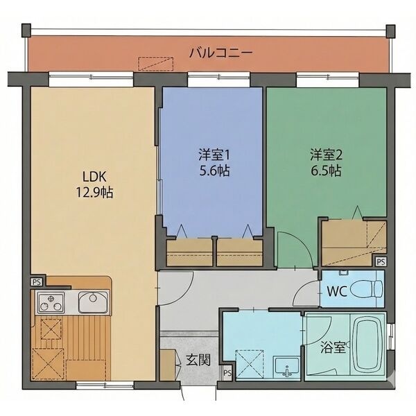 2LDK(58.8m²)└ LDK12.9帖 洋室5.6帖 洋室6.4帖