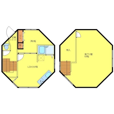2LDK(64.8m²)└ 地下1階:洋室18帖 / 1階:LDK9.9帖 洋室6帖
