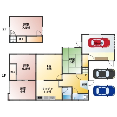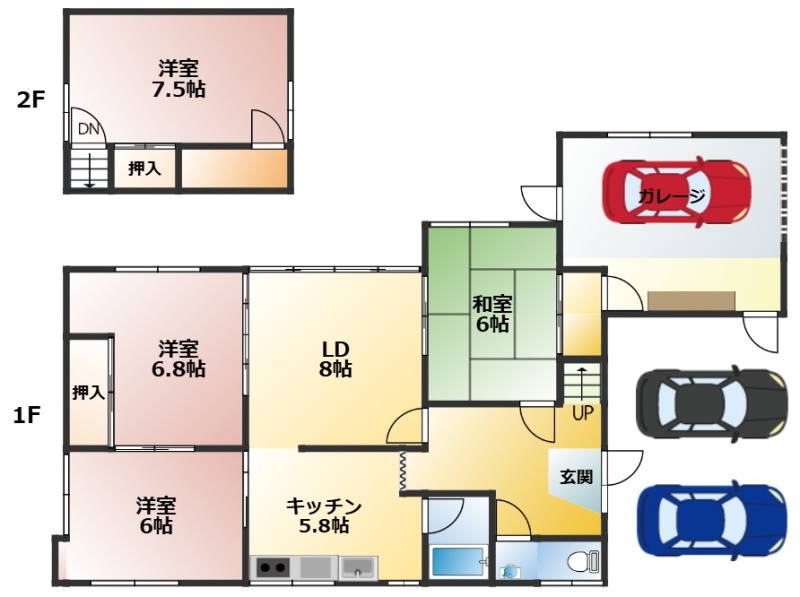 4LDK└ 1階:LD8帖 洋室6.8帖 洋室6帖 和室6帖 K5.8帖 / 2階:洋室7.5帖
