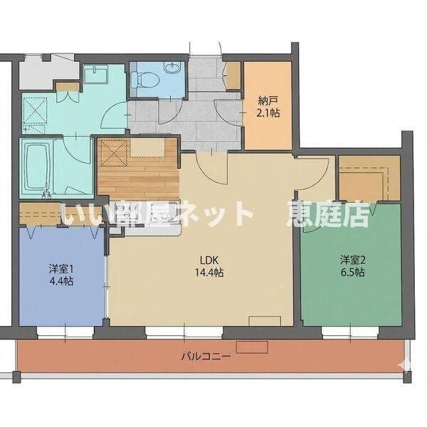 2LDK(62.32m²)└ LDK14.4帖 洋室6.6帖 洋室4.5帖