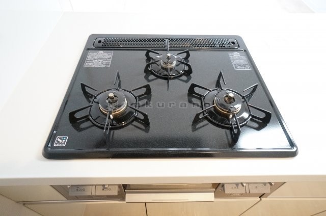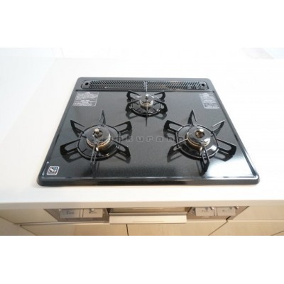 システムキッチンのガスコンロは3口。お料理もはかどります。※