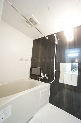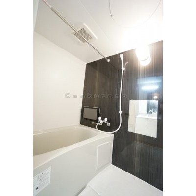 浴室はダークブラウンのアクセントパネルがシック。追い炊きでき