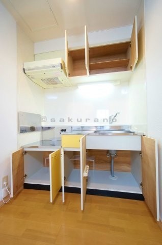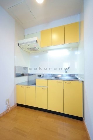 イエローのアクセントがお洒落でチャーミングなキッチン。収納ス