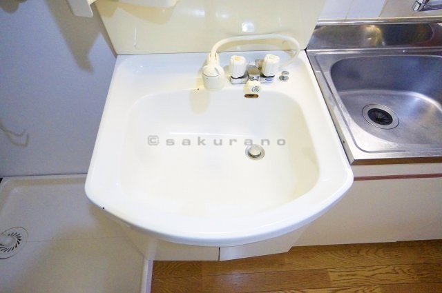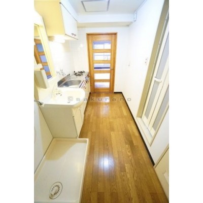 洗濯機置き場、洗面台、キッチンが並んでいます。※写真は同建物