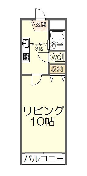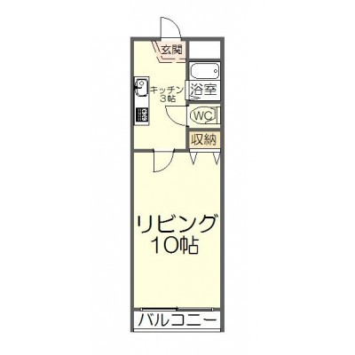 間取りは洋室10帖にキッチン3帖の1K設計。一人暮らしであれば