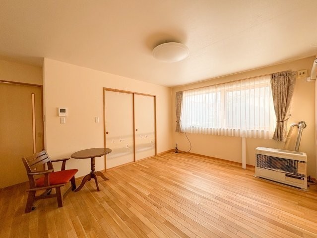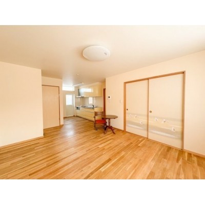 ここに注目!玄関の扉を開けた瞬間、ふわっと木の香りが漂ってきて、自然素材の心地よさを全身で感じられました。壁には湿度を調整してくれる塗り壁が使われており、見た目にも優しく、空気の質が良い印象です。床は無垢材で、素足でも冷たさを感じず、足元から温もりが伝わるような感覚がありました。四季を通じて快適に過ごせるのではないかと感じます。 LDKは14.6帖の広さがあり、大きな窓からは朝の光がたっぷりと差し込みます。取材に訪れたのは午前中でしたが、リビング全体が柔らかな光に包まれており、とても開放的な空間でした。壁や床に自然素材を使っているからか、光の反射も柔らかく、くつろぎの時間にぴったりな雰囲気です。窓際に観葉植物を置いたり、小さな読書スペースを作ったりと、自分らしいインテリアが楽しめそうです。 キッチンはシステムキッチンで、家族との会話を楽しみながら料理ができる配置になっています。キッチン横には食品庫(パントリー)が設けられており、まとめ買いした食材や日用品をすっきり収納できます。動線もスムーズで、調理から片付けまで効率よくこなせそうです。