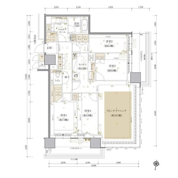 4LDK(104.57m²)└ LD18.5帖 K3.8帖 洋室7帖 洋室6.3帖 洋室6帖 洋室5.8帖